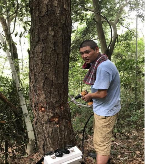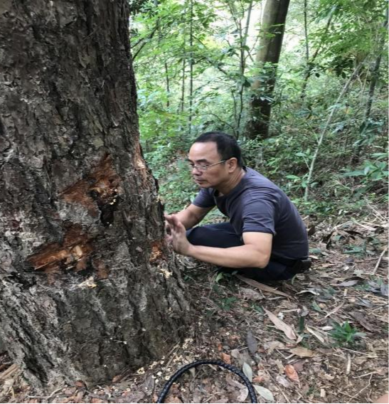 2022年9月8號,汪洋帶上綠友電動樹干打孔注藥機、木塞、藥品以及相應工具。早上五點鐘從廣州出發,舟車勞頓數百公里,踏上拯救坪坑參天古樹的旅程。趕到潮州坪坑村,村委部文主任領路去村后的山上查看古松樹。在看過所有的古樹以后,根據松樹的枯葉癥狀,樹木呈現出來的病癥,最后診斷確認是松材線蟲危害所致。汪洋將診斷結果以及解決方案告知文主任,并通過電話向省林業部領導作匯報,得到批復后立即展開作業。