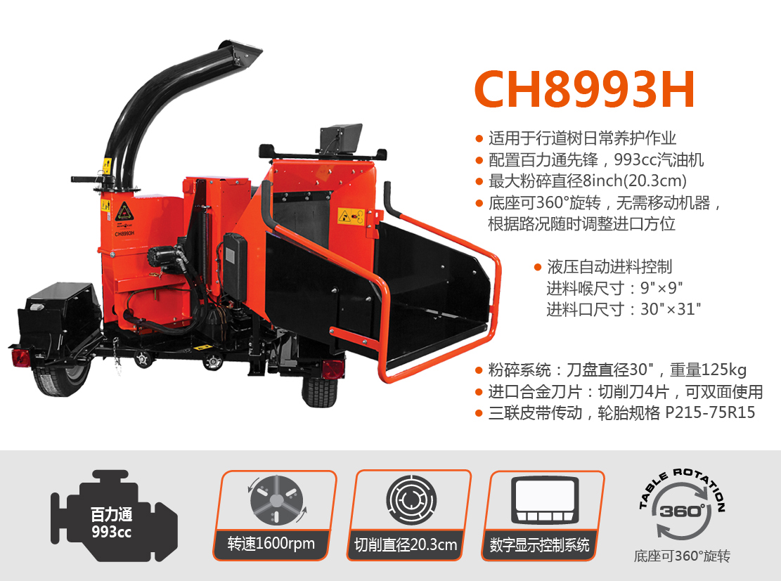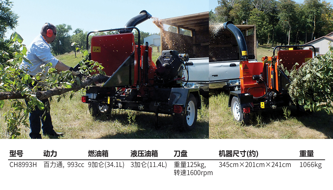 老熊(BEARCAT)品牌樹枝粉碎機,配置百力通先鋒993cc發動機,最大可切削直徑20cm樹枝。